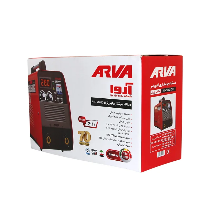 دستگاه جوش آروا مدل ۲۱۱۸ با حداکثر جریان خروجی ۲۸۰ آمپر مزیت های بسیار دارد. این اینورتر جوشکاری کارایی بسیار زیادی دارد و از قدرت بالایی برخوردار است. با توجه به میزان آمپری که دارد مناسب برای استفاده در انواع پروژه های صنعتی است و بسیار پرکاربرد می باشد. آروا، برای خنک کردن این دستگاه هنگام کار فن ۴۲۰۰ دور تایوانی استفاده کرده و بدنه بسیار زیبا و منحصر به فردی را برای آن در نظر گرفته است. این دستگاه اینورتر دارای انبر جوش و انبر اتصال به همراه کابل می باشد. دیگر مزیت ها را در ادامه معرفی می کنیم.