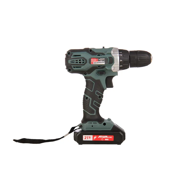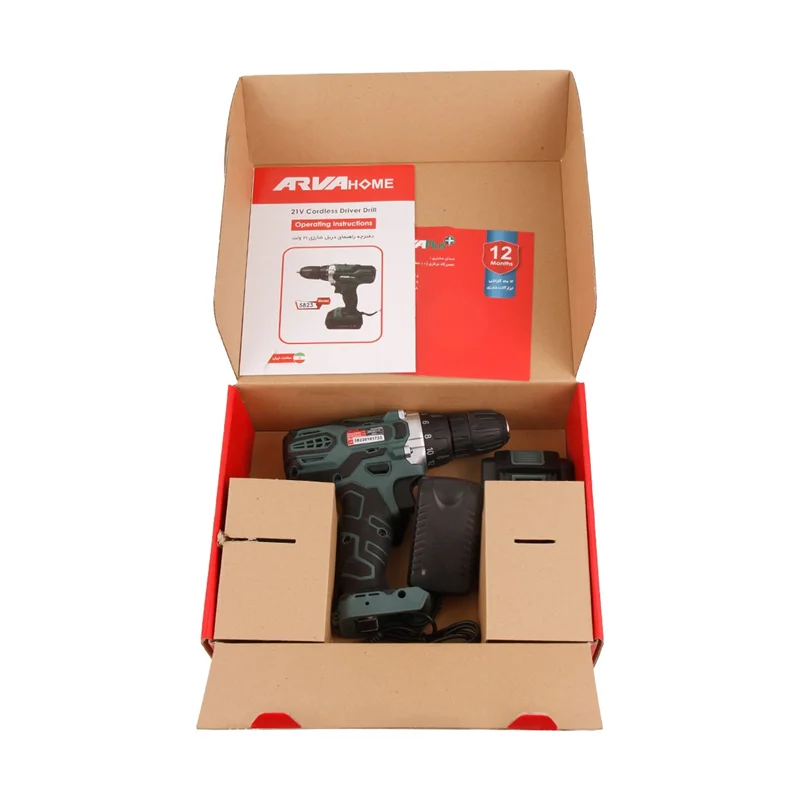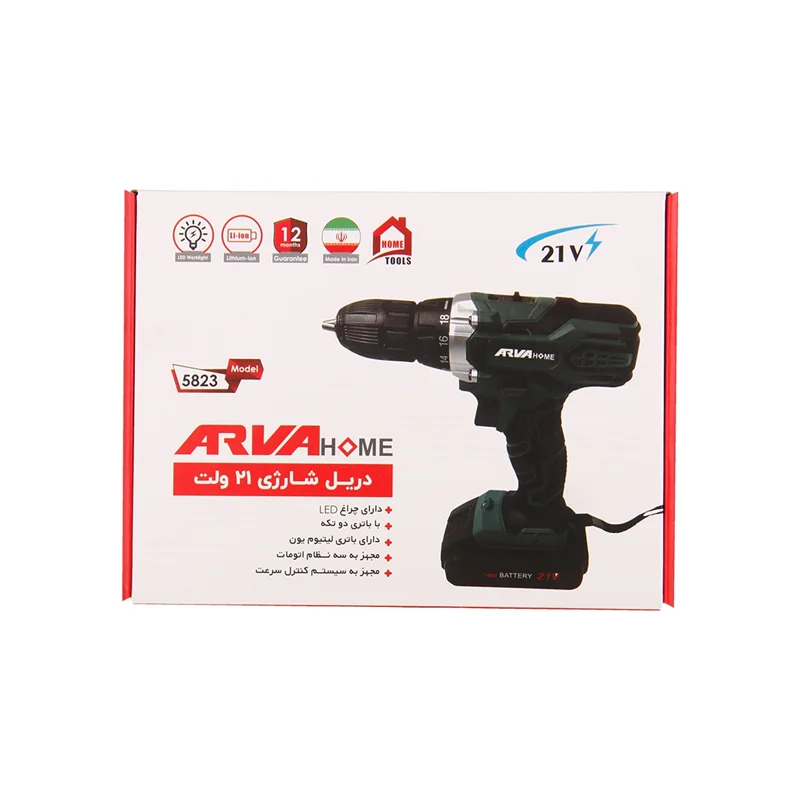 دریل شارژی آروا ۵۸۲۳ دارای دو باتری با ظرفیت ۲۰۰۰ میلی آمپر ساعت با جنس لیتیوم یون است و به راحتی توسط شارژر موجود در جعبه می توانید آن را شارژ کنید. جریان خروجی شارژر یک آمپر است و می توانید آن را به برق شهری وصل کنید. برای تعویض باتری نیز یک ضامن آزاد کننده وجود دارد که به وسیله آن می توانید اینکار را انجام دهید.