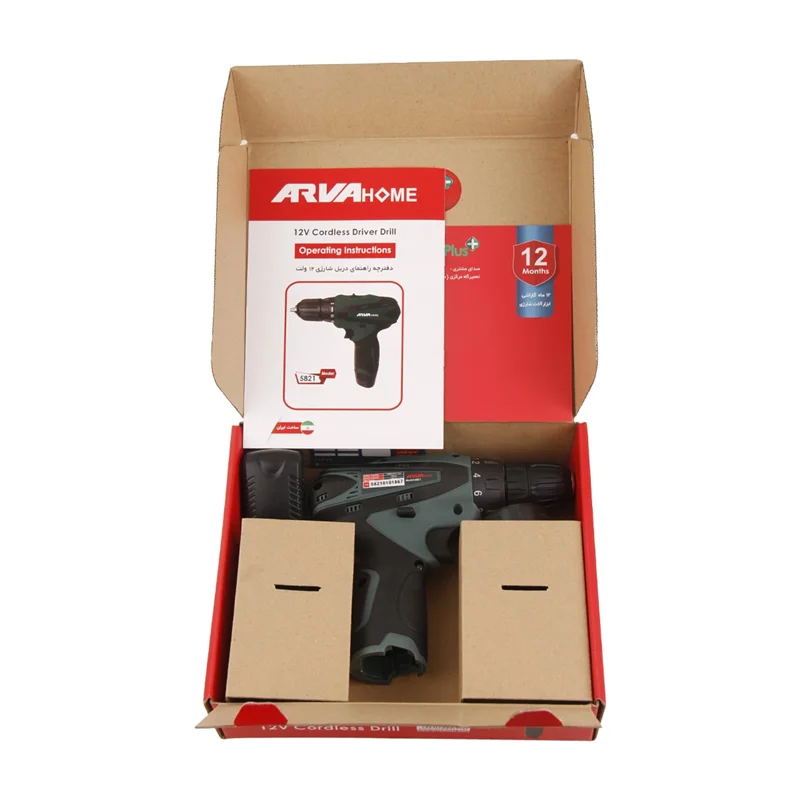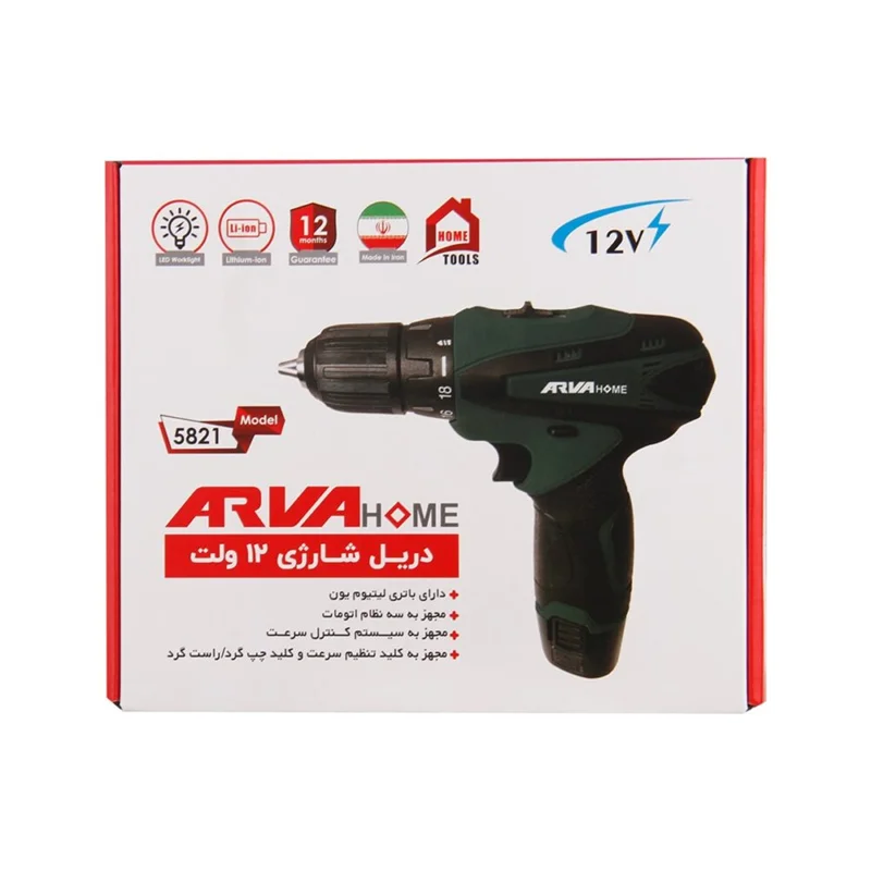 داخل کارتن دریل پیچ گوشتی شارژی آروا ۵۸۲۱، به همراه خود دستگاه، شارژر، ۲عدد باتری، دفترچه راهنما و کارت گارانتی وجود دارد. وزن این ابزار ۹۵۰ گرم است که کار با دریل شارژی را آسان تر می کند. دریل خانگی ۵۸۲۱ دارای کلید تغییر جهت چرخش (چپ گرد و راست گرد) است. کلید روشن خاموش این دستگاه به صورت گازی است یعنی با فشار دادن بیشتر این کلید می توانید سرعت دستگاه را تنظیم کنید. همانطور که قبلا بیان کردیم این دستگاه دارای گیربکس ۲ سرعته است و اهرم تغییر حالت گیربکس نیز روی دستگاه وجود دارد.